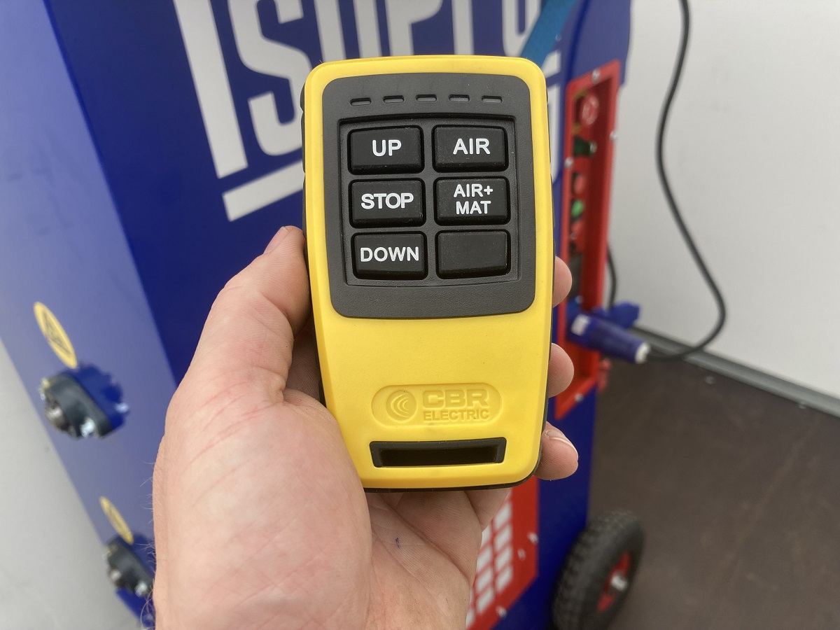 Den har en trådløs fjernbetjening, så personen som spreder materialet har fuld kontrol over hvornår maskinen skal sprøjte og hvornår den skal holde pause.