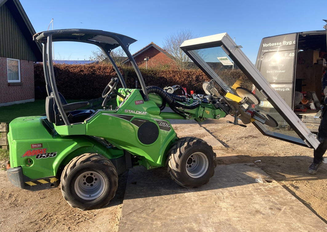 Avant Minilæsser med påmonteret batteri-drevet vinduesløfter, er det perfekte redskab til løft og montering af vinduer i forskellige størrelser. De indbyggede batterier har en høj kapacitet, som giver mulighed for at arbejde en hel dag.