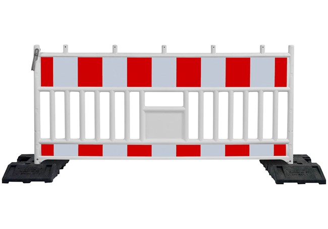 Afspærringshegn / spærrebom med føder, lavet i rød/hvid plast. Der er refleks på den ene side.