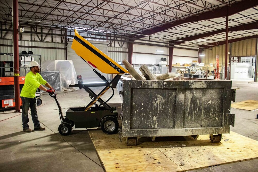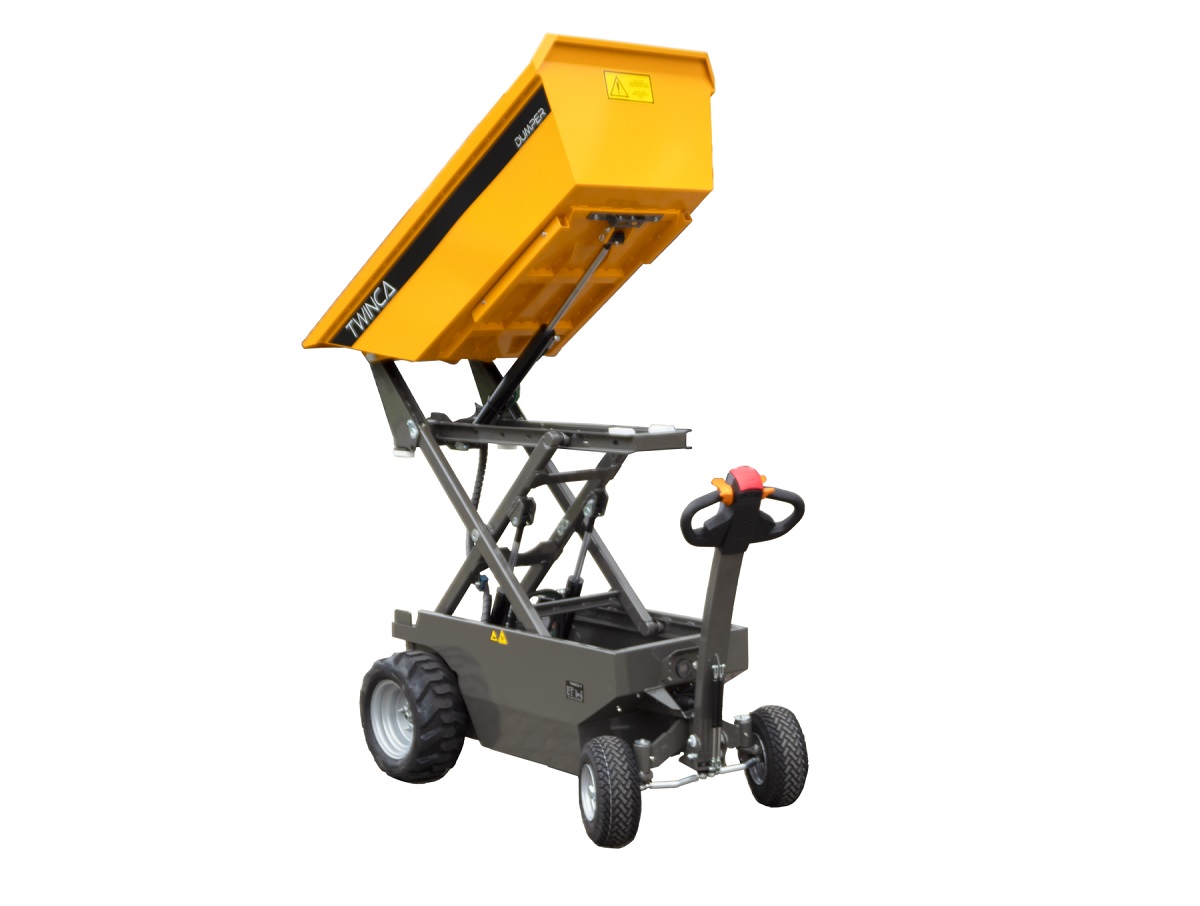 Denne dumper/motortrillebøre er udstyret med sakselift, så den kan læsse af i en container, eller på en trailer.