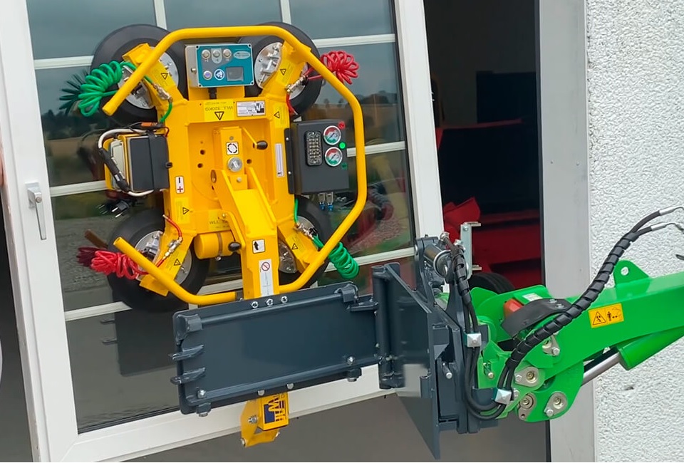 Vinduesløfteren sidder monteret på et vippe- og drejebeslag, hvilket giver mulighed for at monterer vinduer langs med bygninger, og tilt-adaptoreren giver en tilpasningsmulighed på +/- 45°, og alt det sammen med en Avant minilæsser med udskud i armen, gør der lettere og langt mindre nedslidende at monterer vinduer i forskellig terræn og under vanskelige forhold.