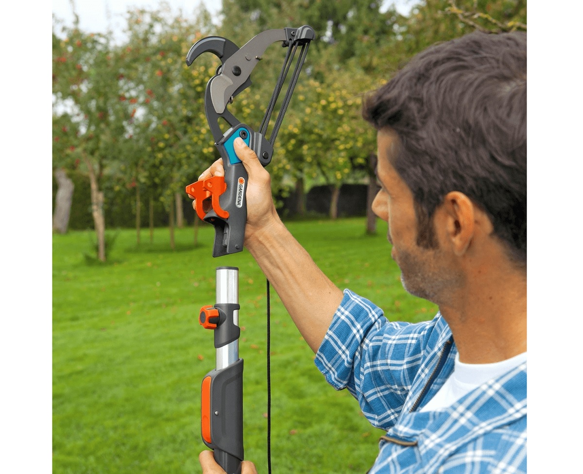 Gardena combi-system, som kan lejes med en grensav og en grensaks med sideskær. Havesaven kan både bruges nede tæt på og oppe i højden, og krogen på saven gør det nemmere at trække afsavede grene ned.