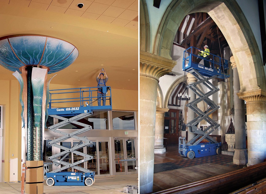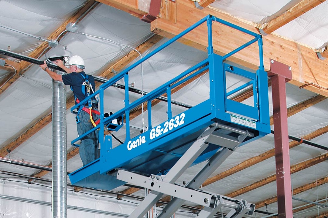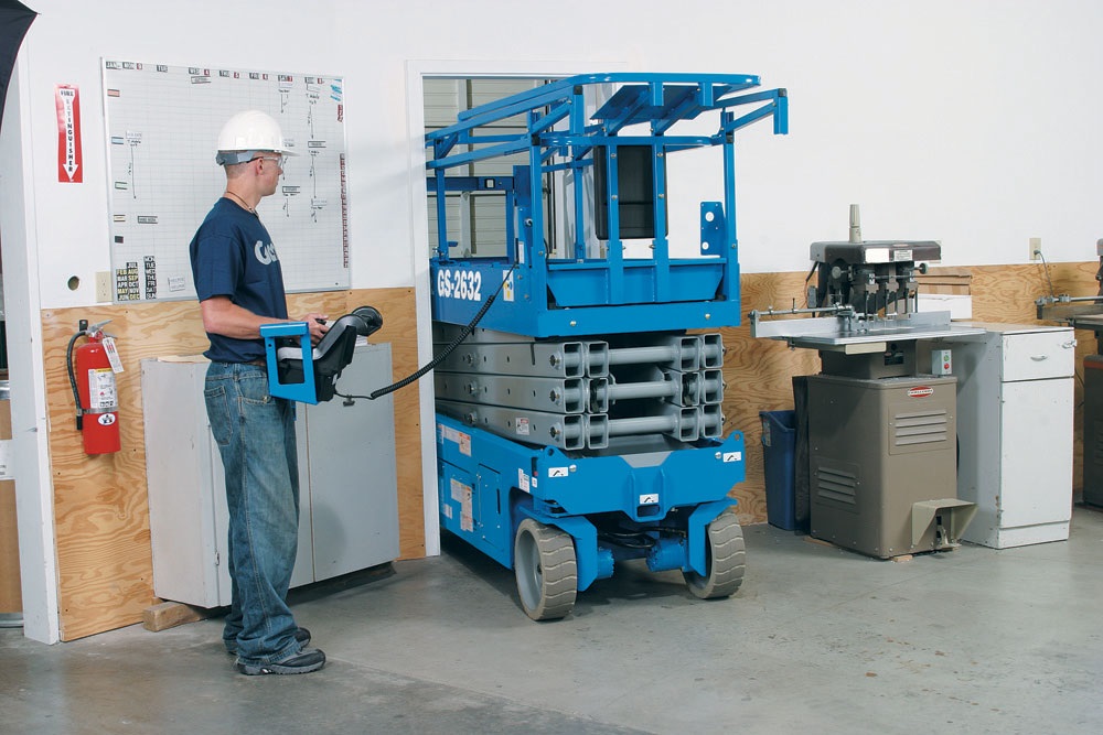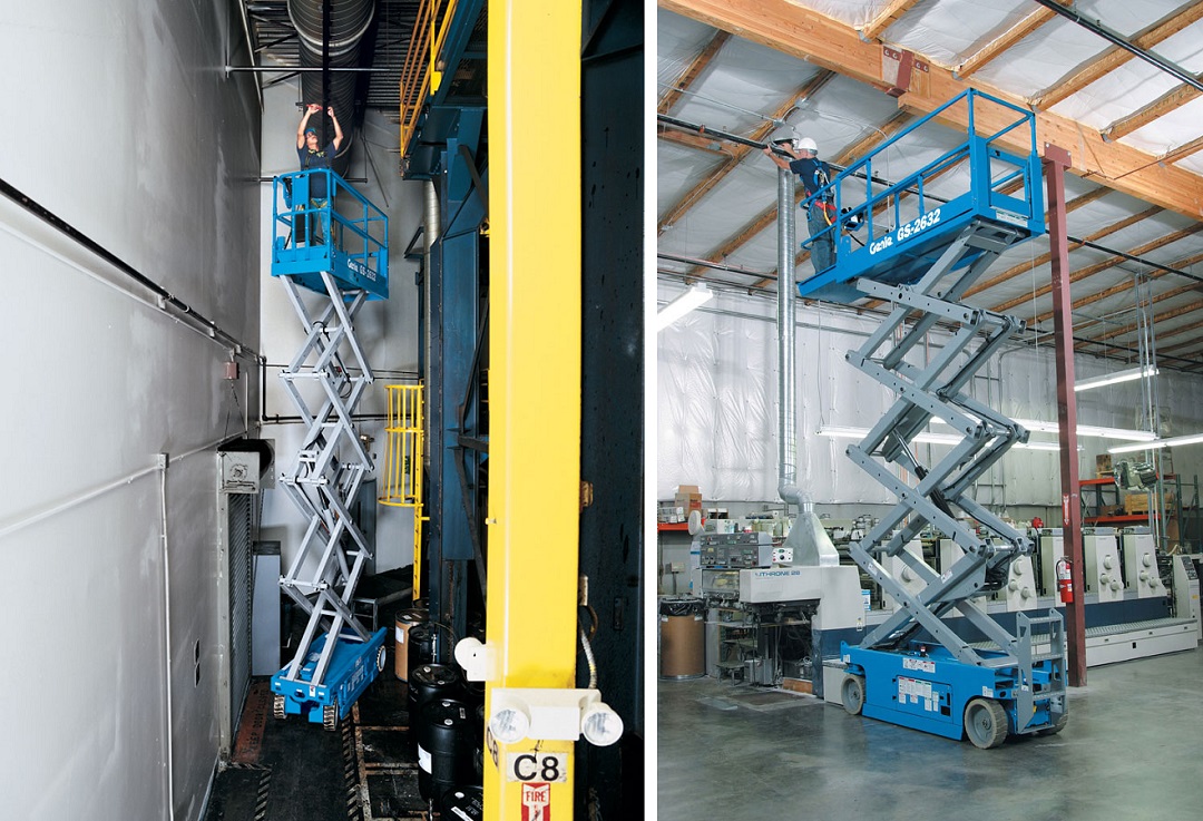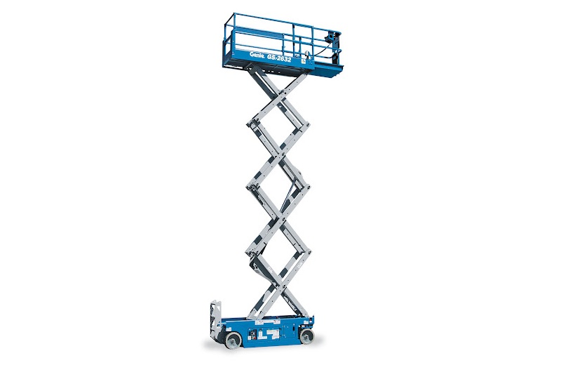 Større saxlift med stor arbejdsplatform, som både kan bruges til inden- og udendørs arbejde. Dette er vores smalle 10 meter saxlift, med en bredde på kun 81 cm, hvilket gør at den komme ind af de fleste døre